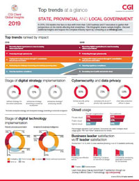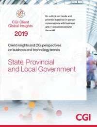 Annually, CGI leaders around the world meet face-to-face with business and IT executives to gather their perspectives on the trends affecting their enterprises, including business and IT priorities, IT spending and investment plans. In 2019, we conducted in-person interviews with 152 client executives in state, provincial and local government who report the need to continue to digitize citizen services is reinforced in this year’s top trends and business priorities, supported by the top IT priority of modernization.